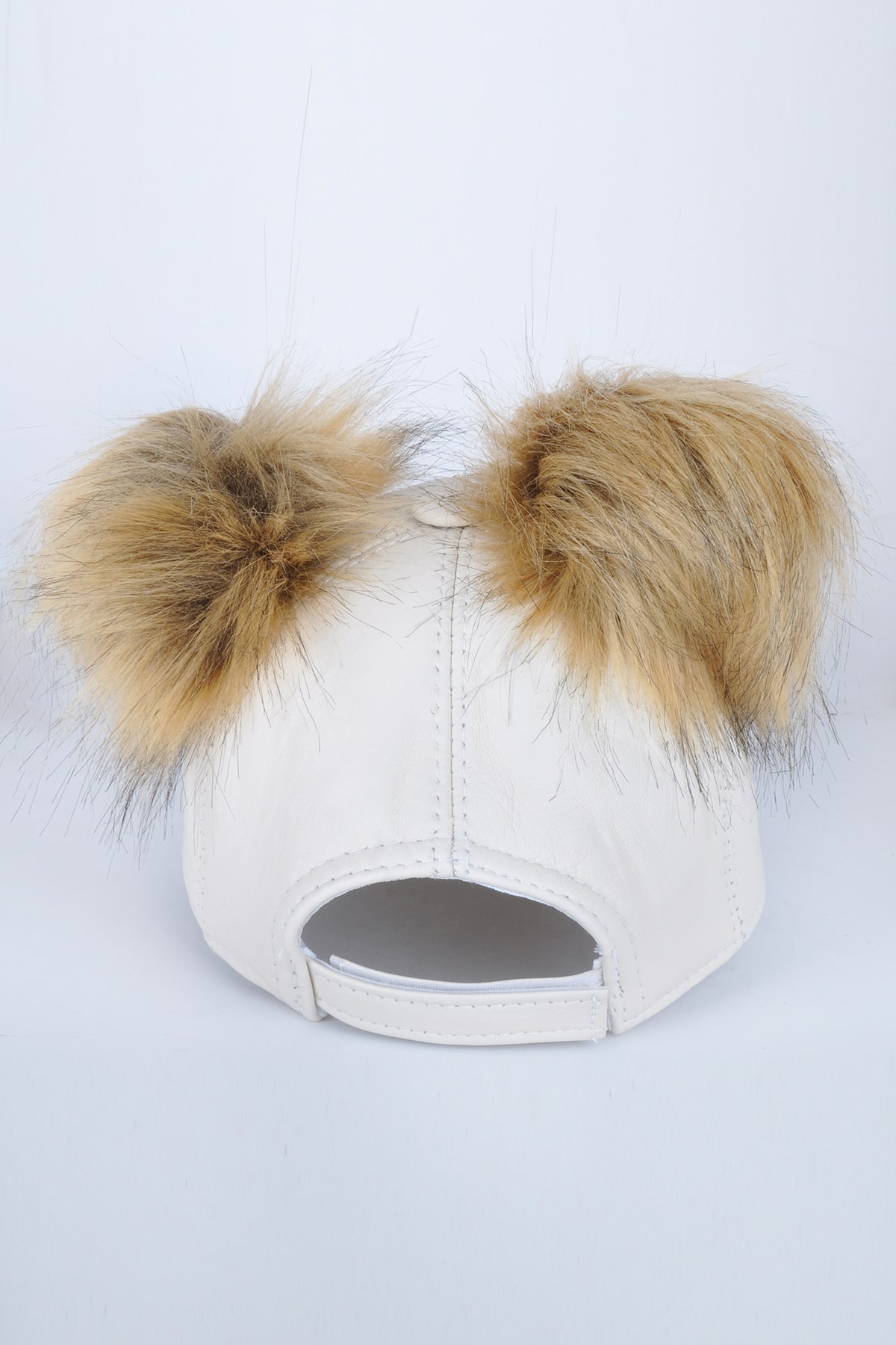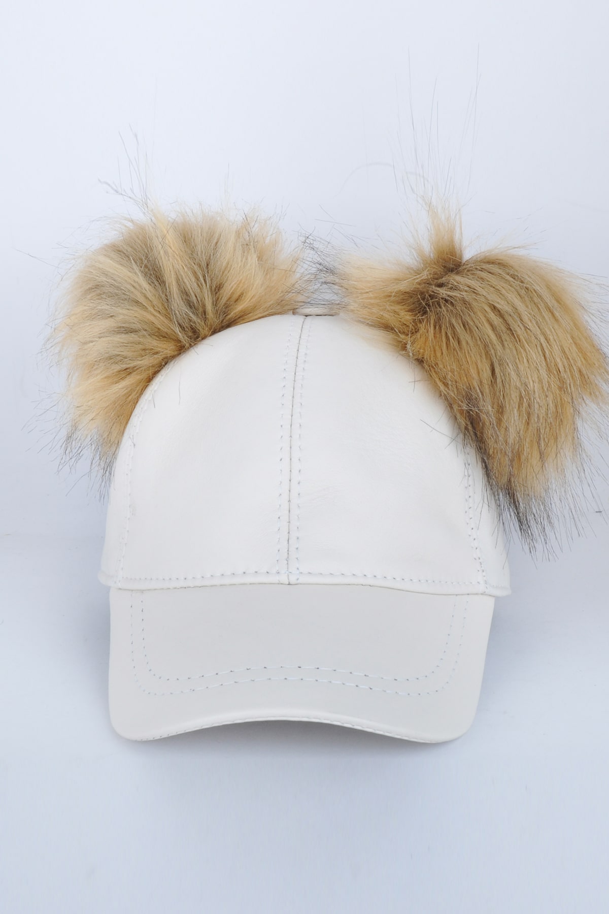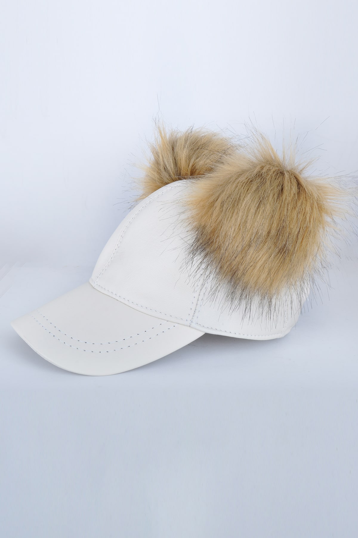 Beyaz Çift Ponponlu Deri Şapka