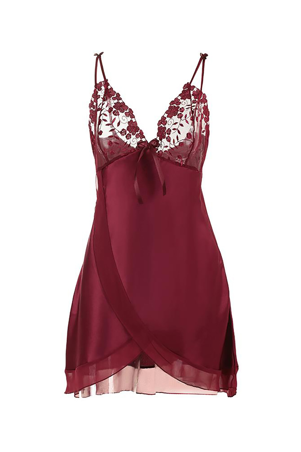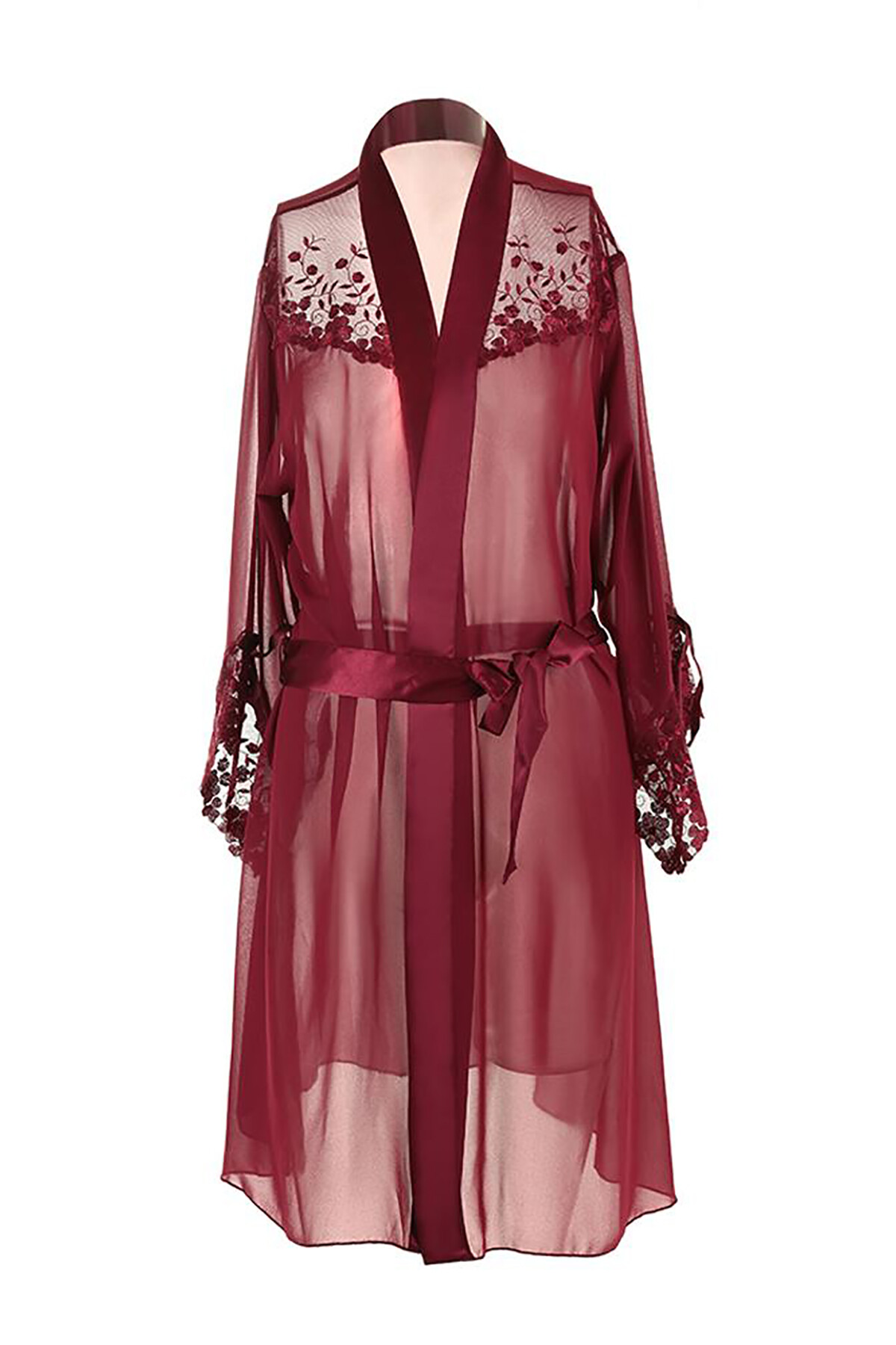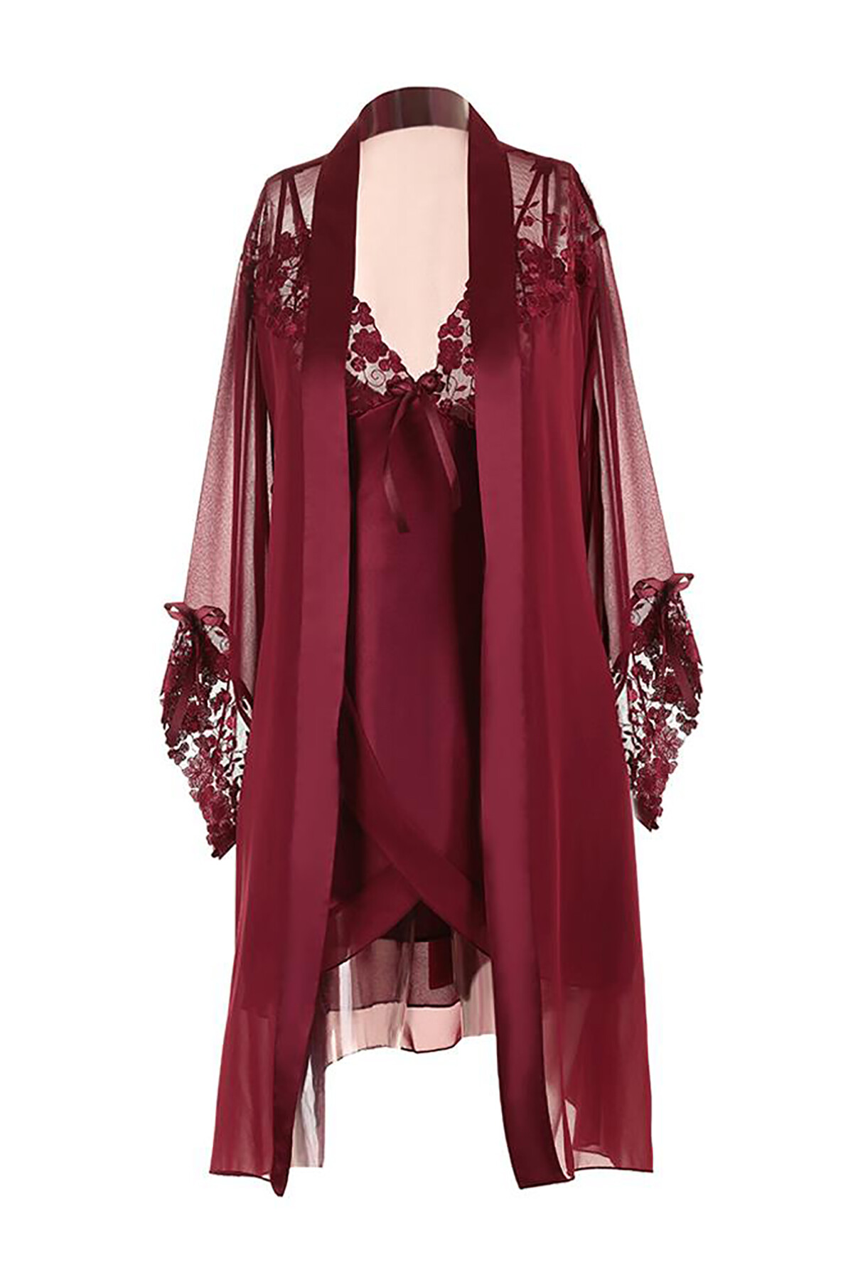 Bordo Fantezi Saten Gecelik Tül Sabahlık Takım