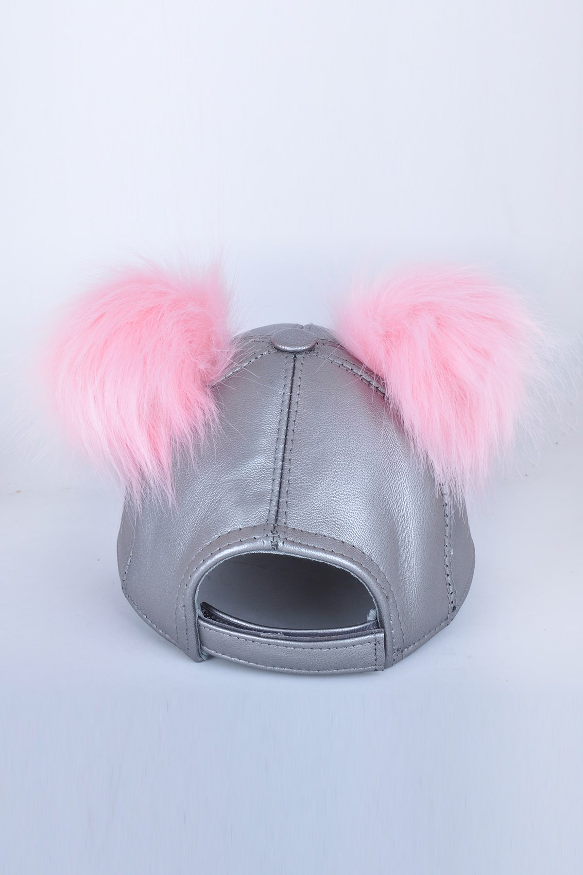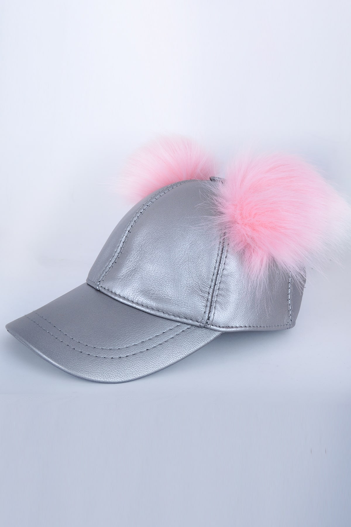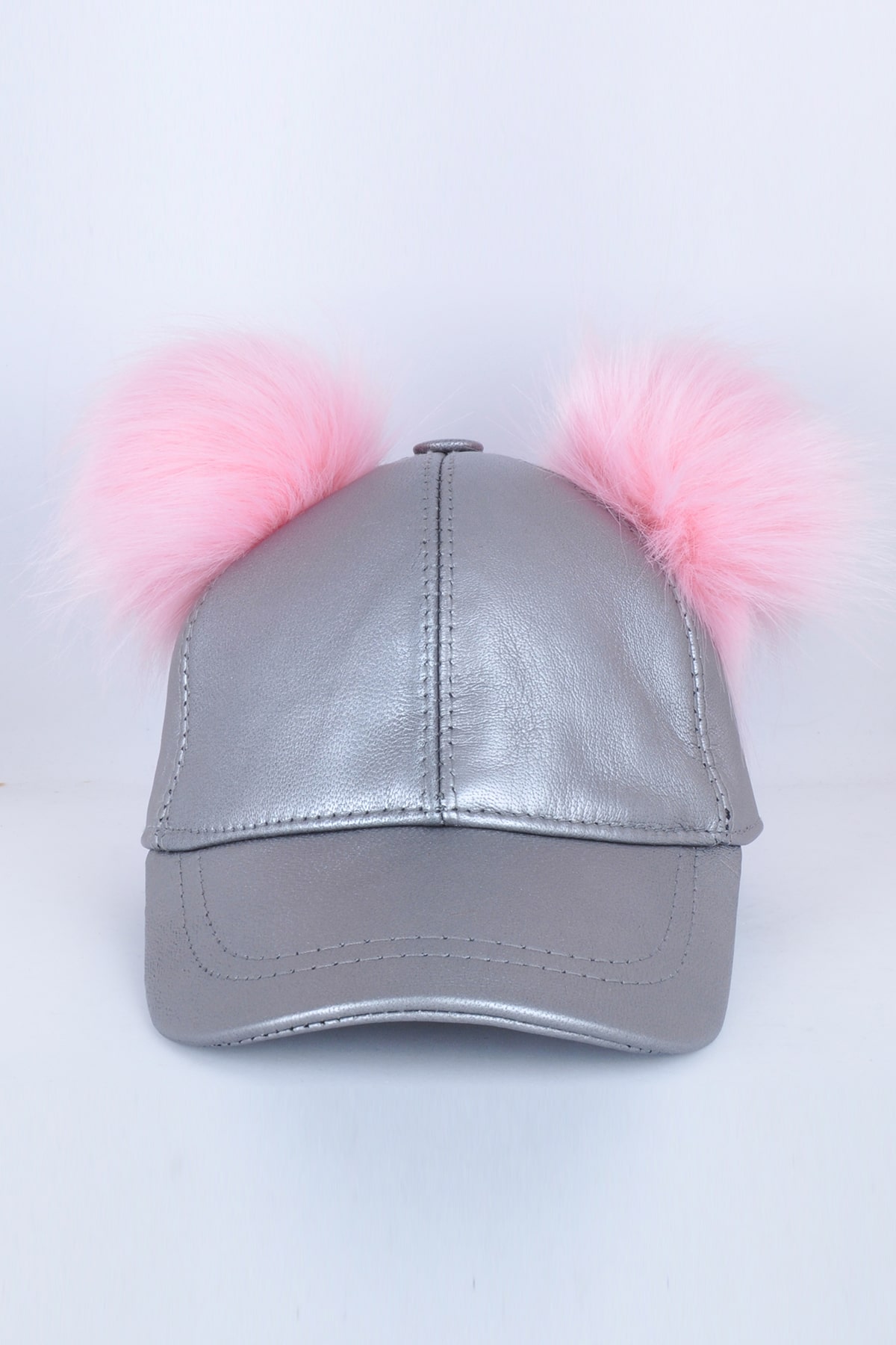 Çift Pembe Ponponlu Gümüş Deri Şapka