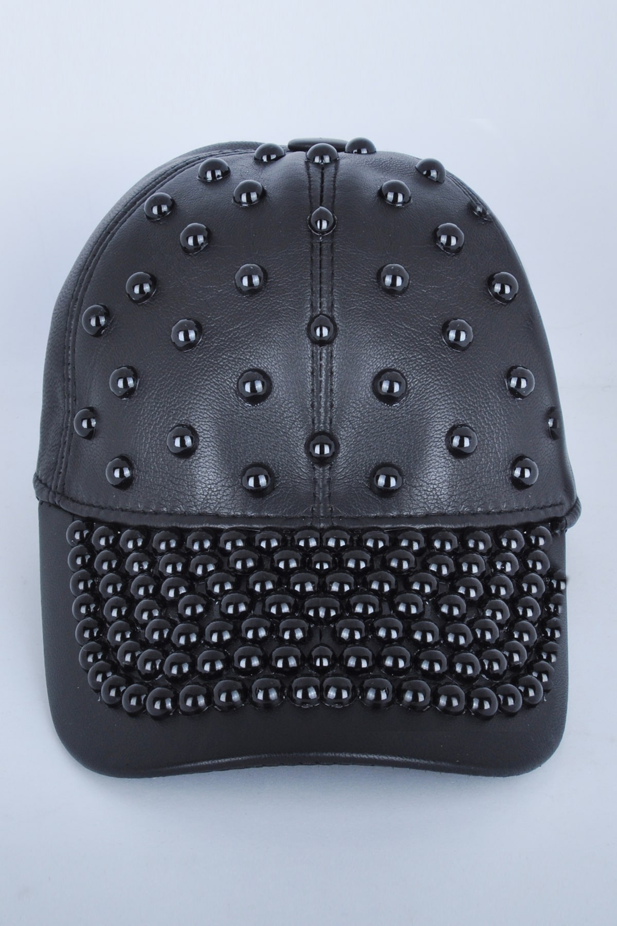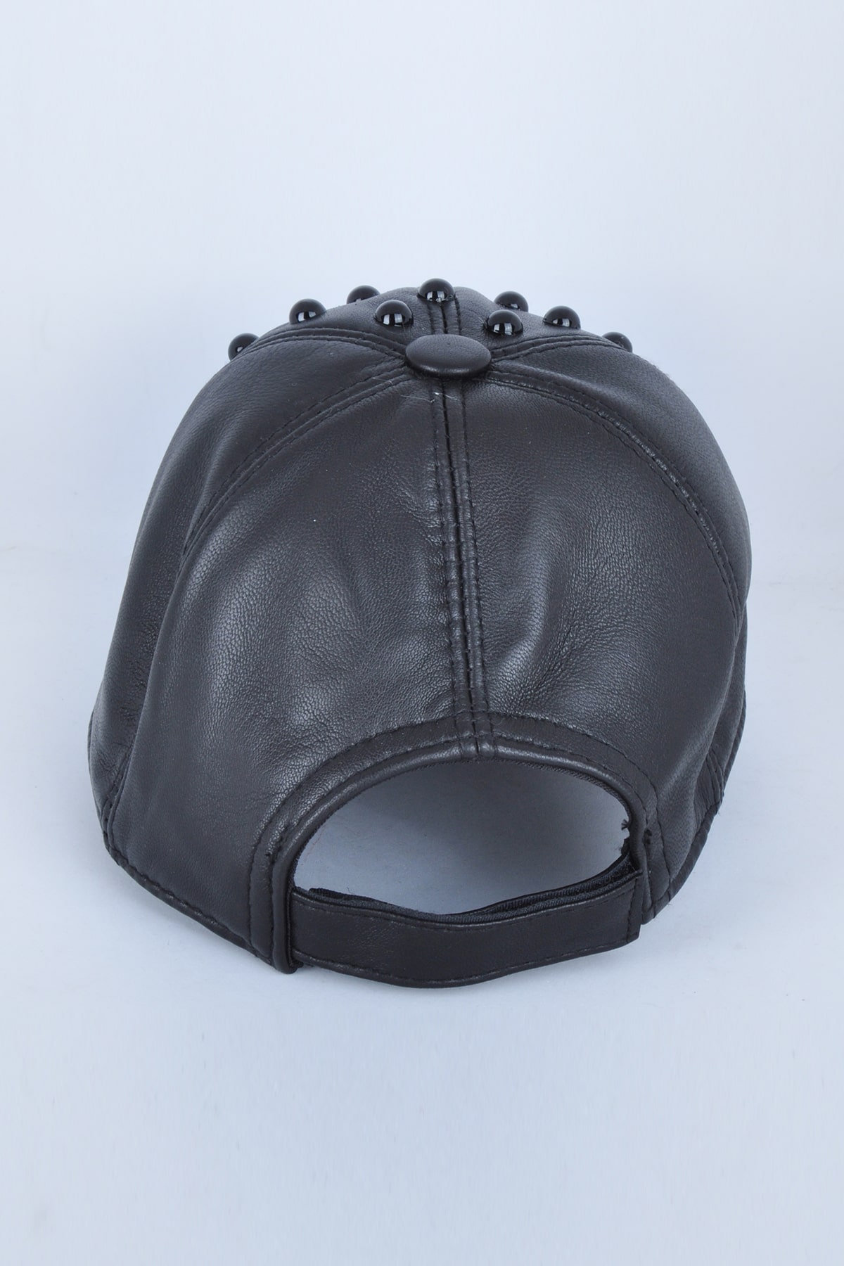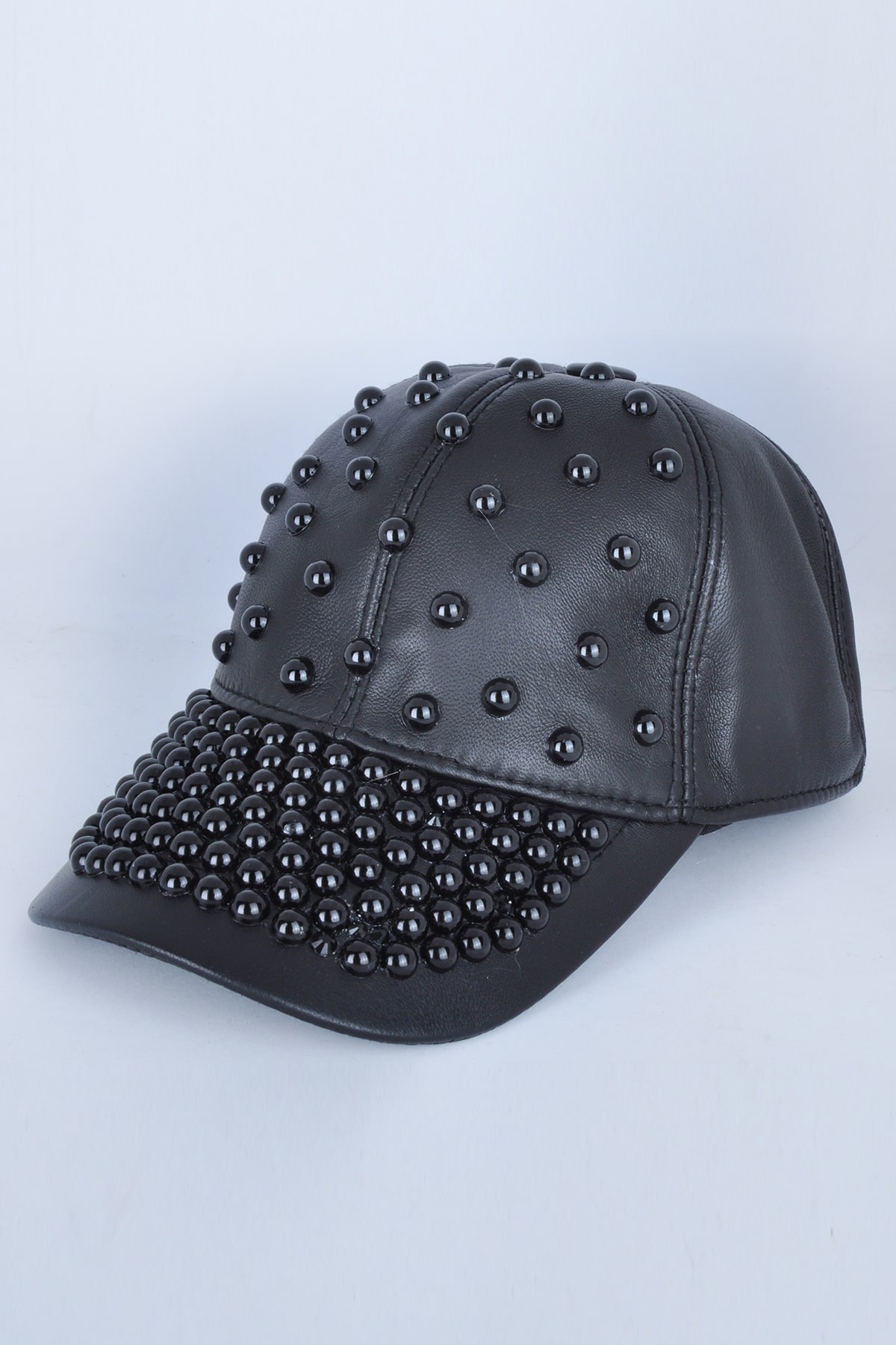 İnci Taşlı Çok Boncuklu Siyah Deri Şapka