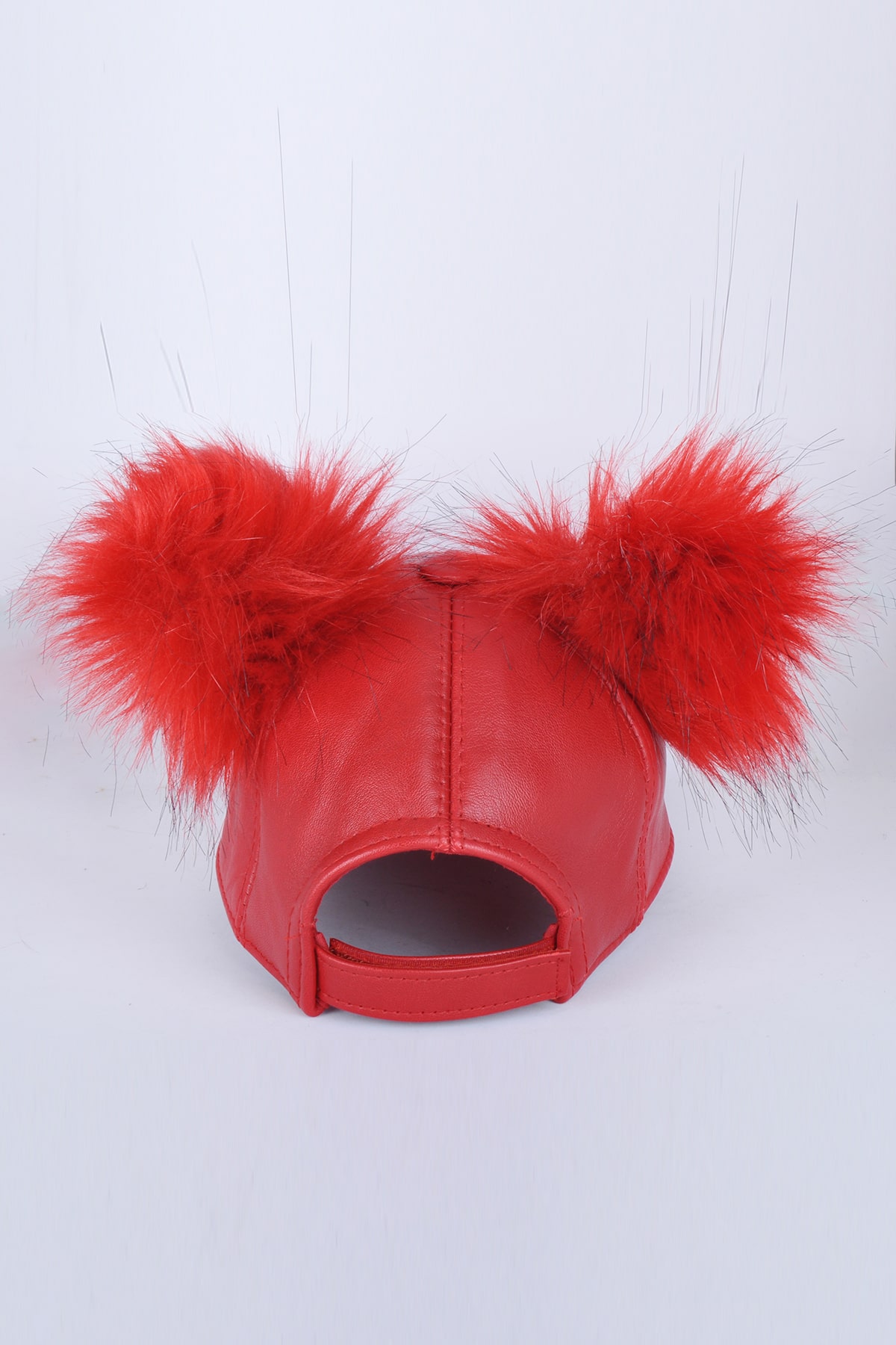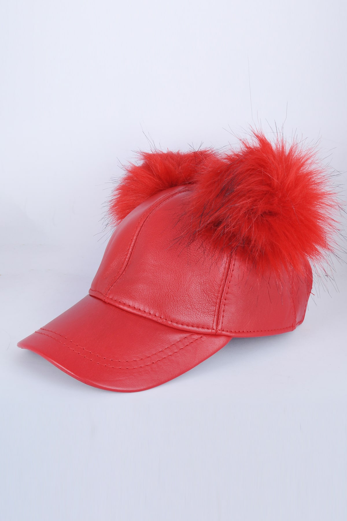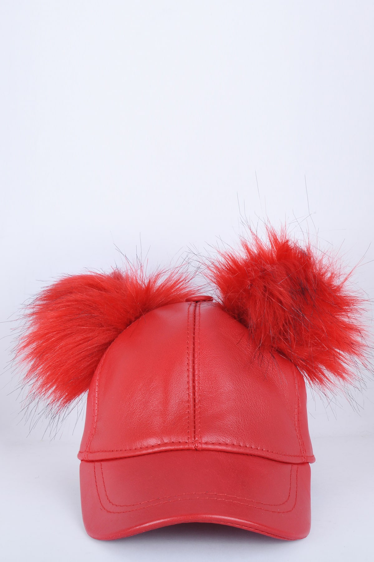 Kırmızı Çift Ponponlu Deri Şapka