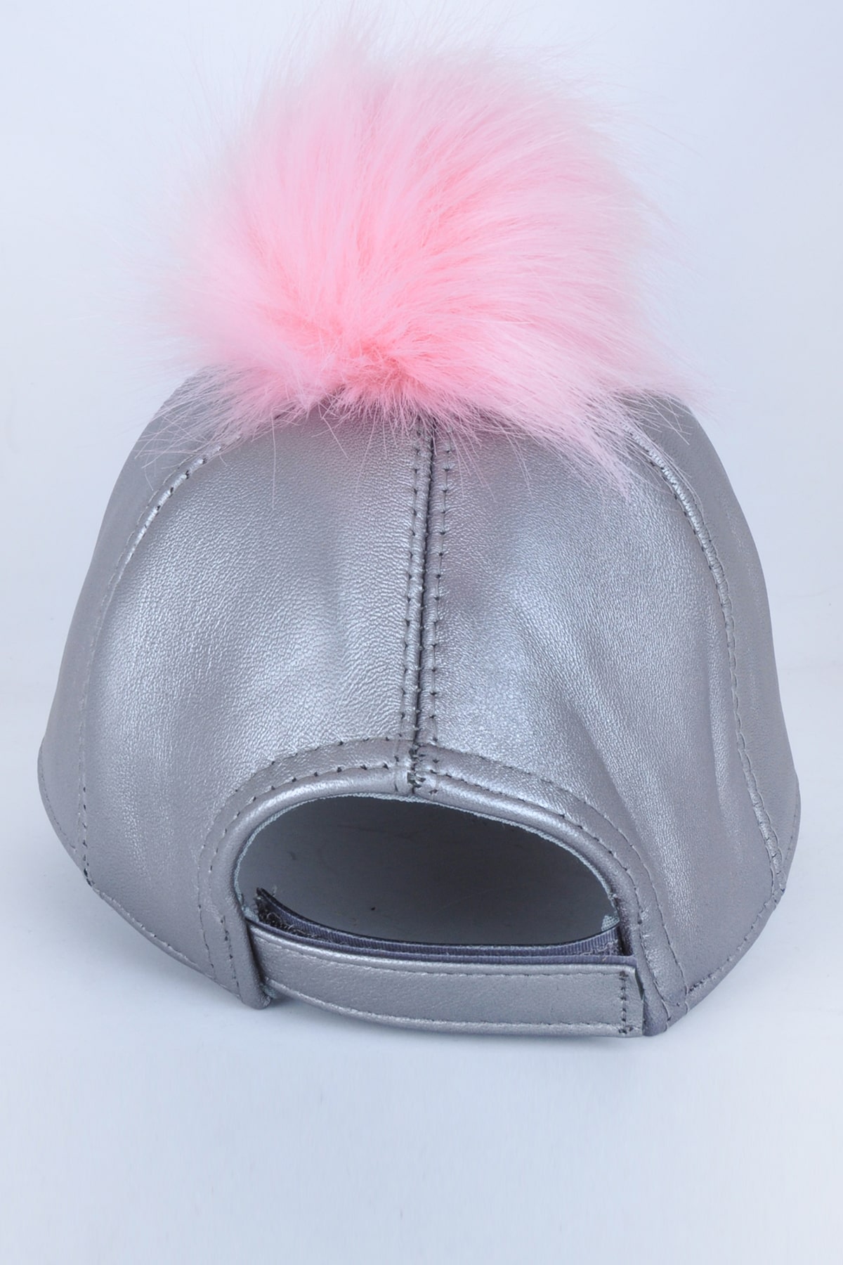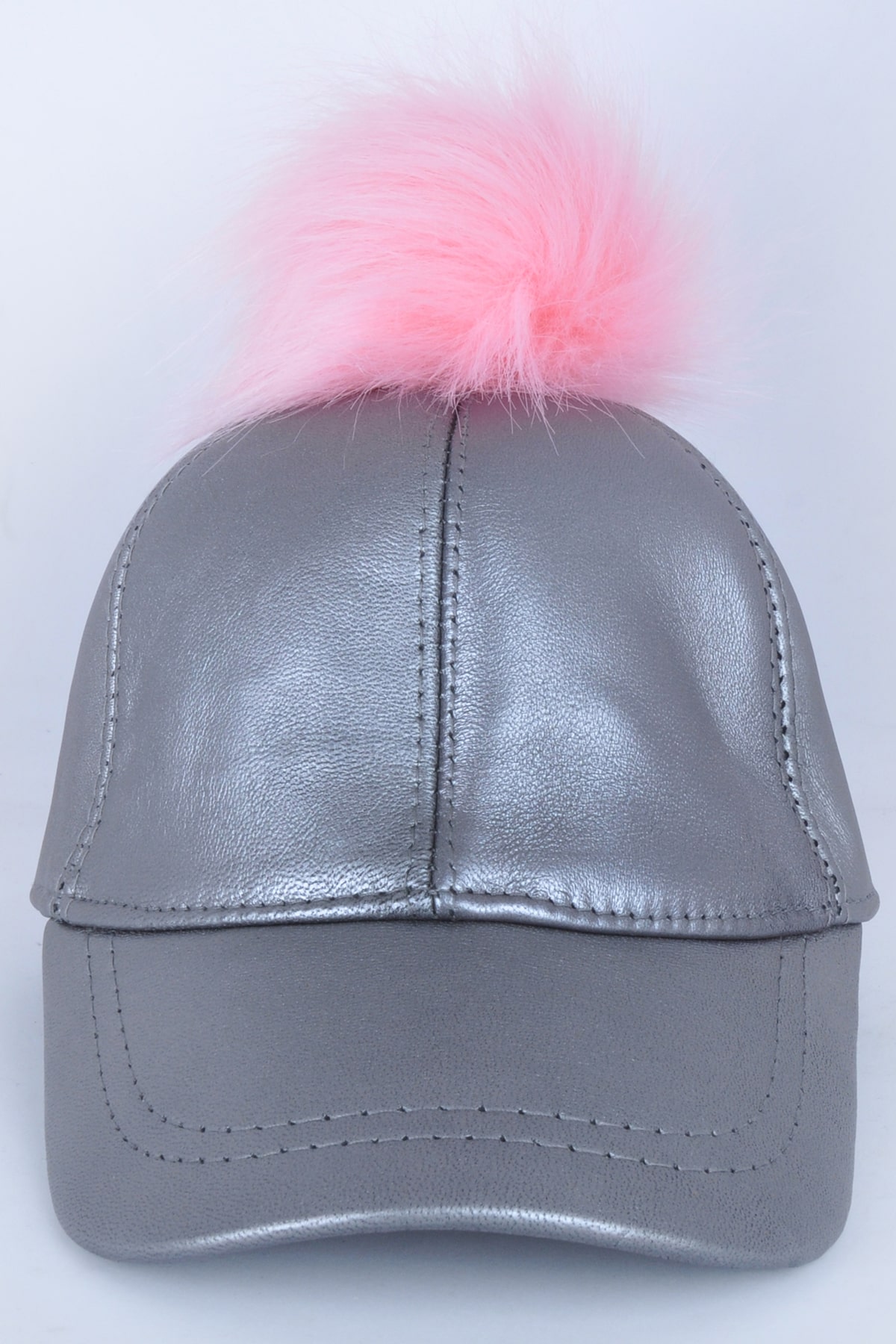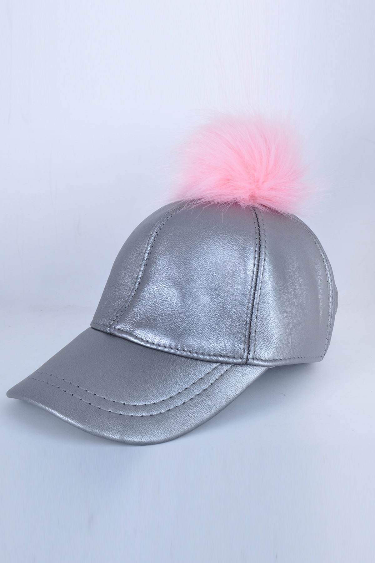 Tek Pembe Ponponlu Gümüş Deri Şapka