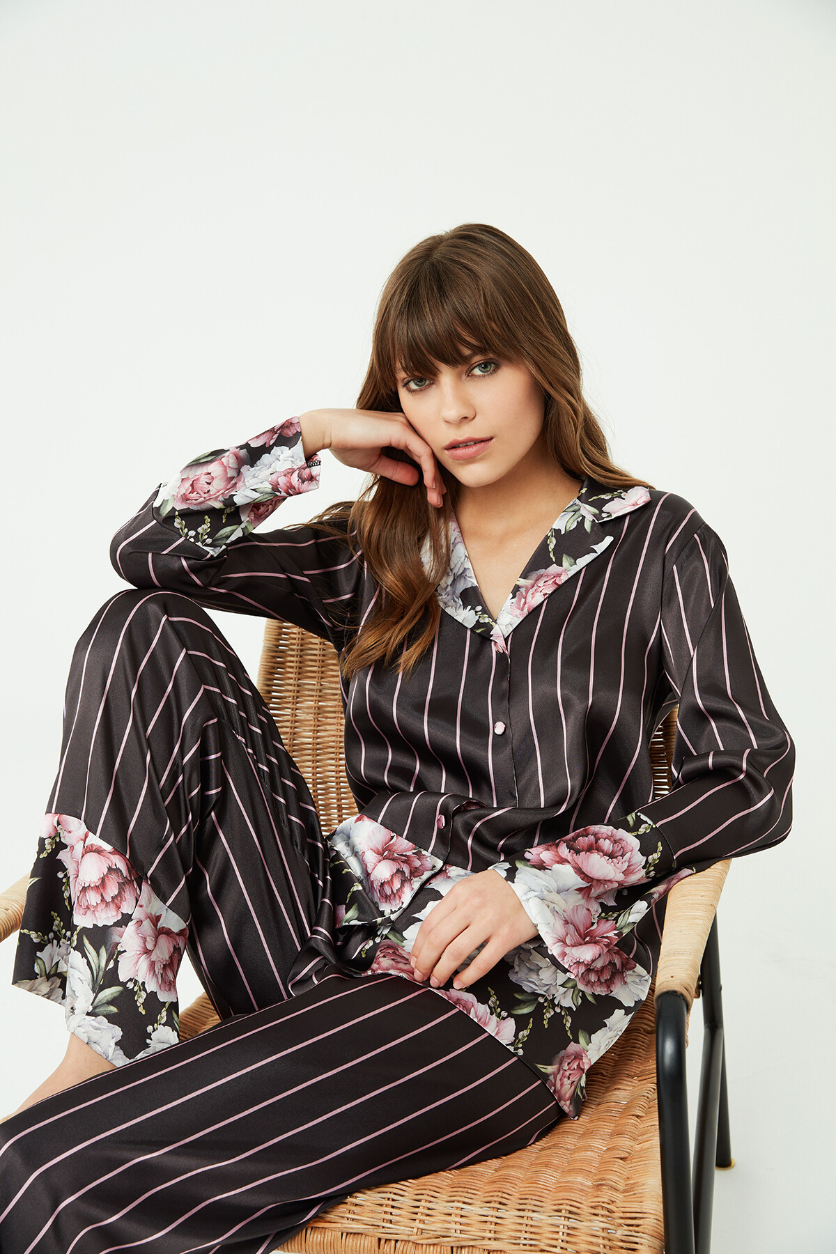 Siyah Çizgili Çiçek Detaylı Saten Pijama Takımı