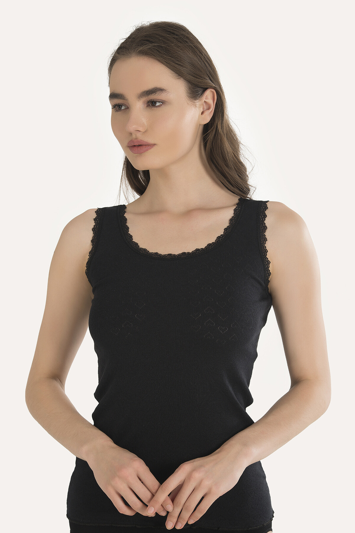 Kalın askılı kalp desenli jakarlı atlet günlük hem rahat ve konforlu hem de şık bir görünüme sahiptir. Sıcak tutan yumuşak atlet ; yakası ve askıları dantel detaylı olup vücuda esnek yapısıyla uyum sağlar.