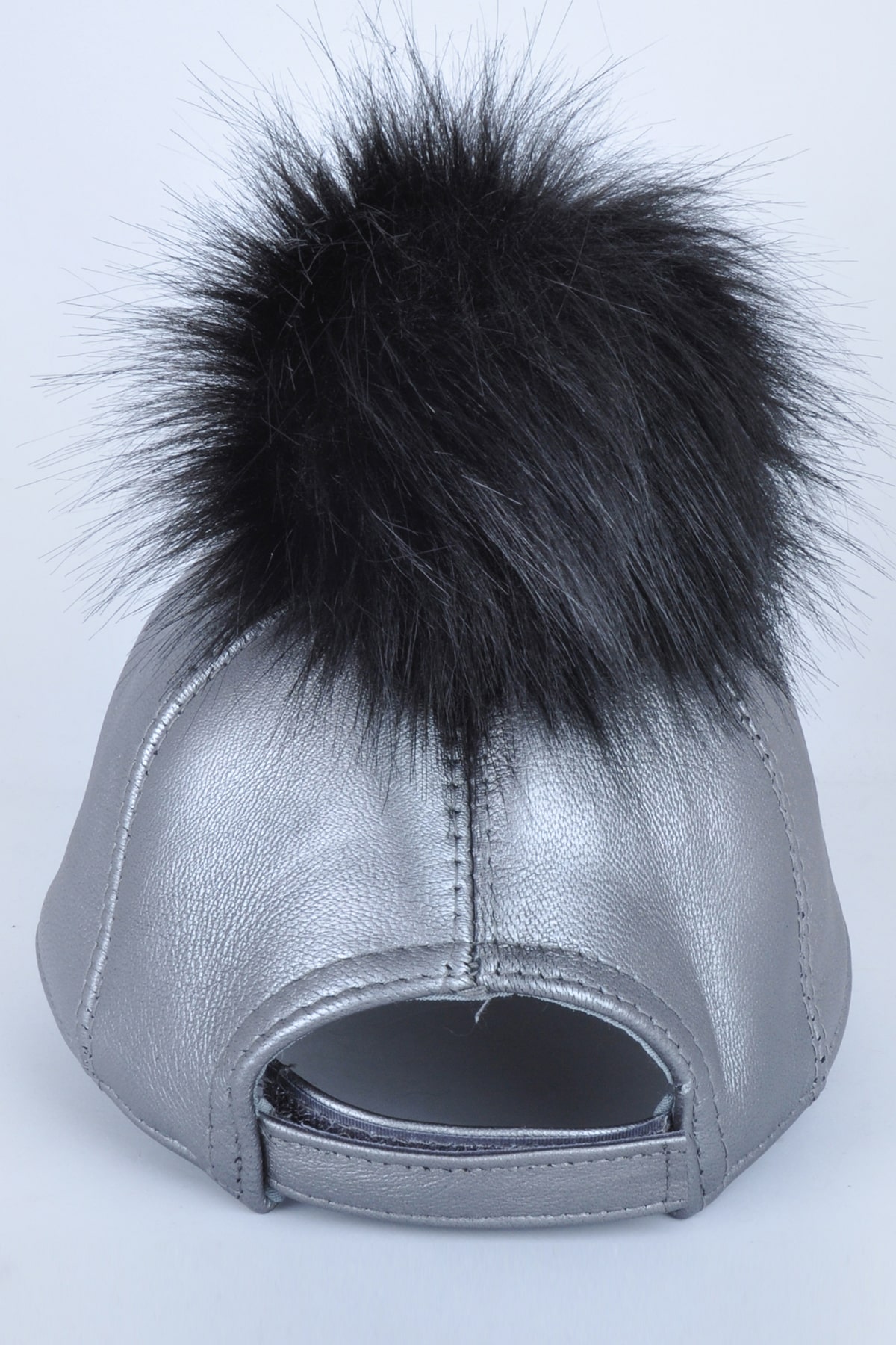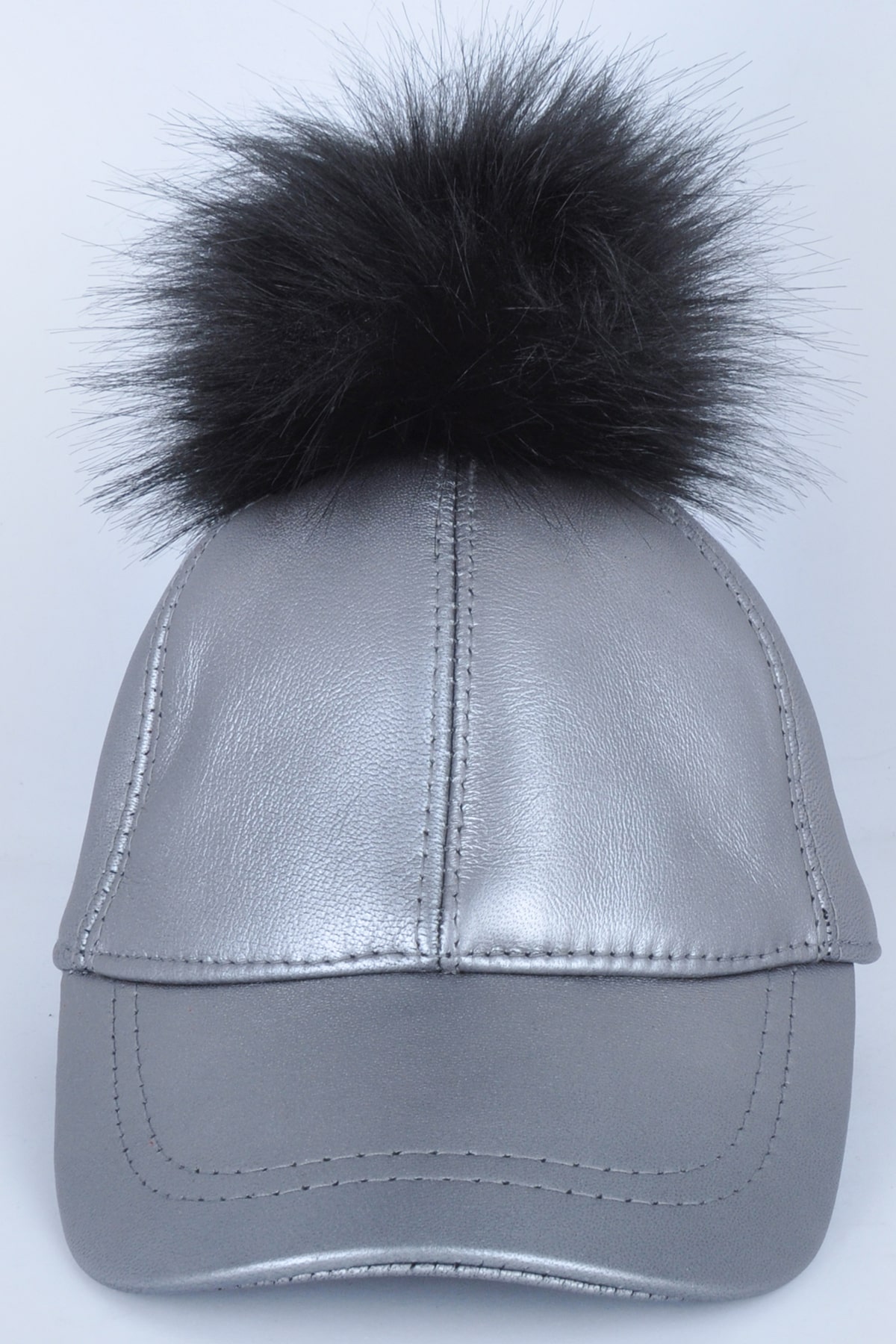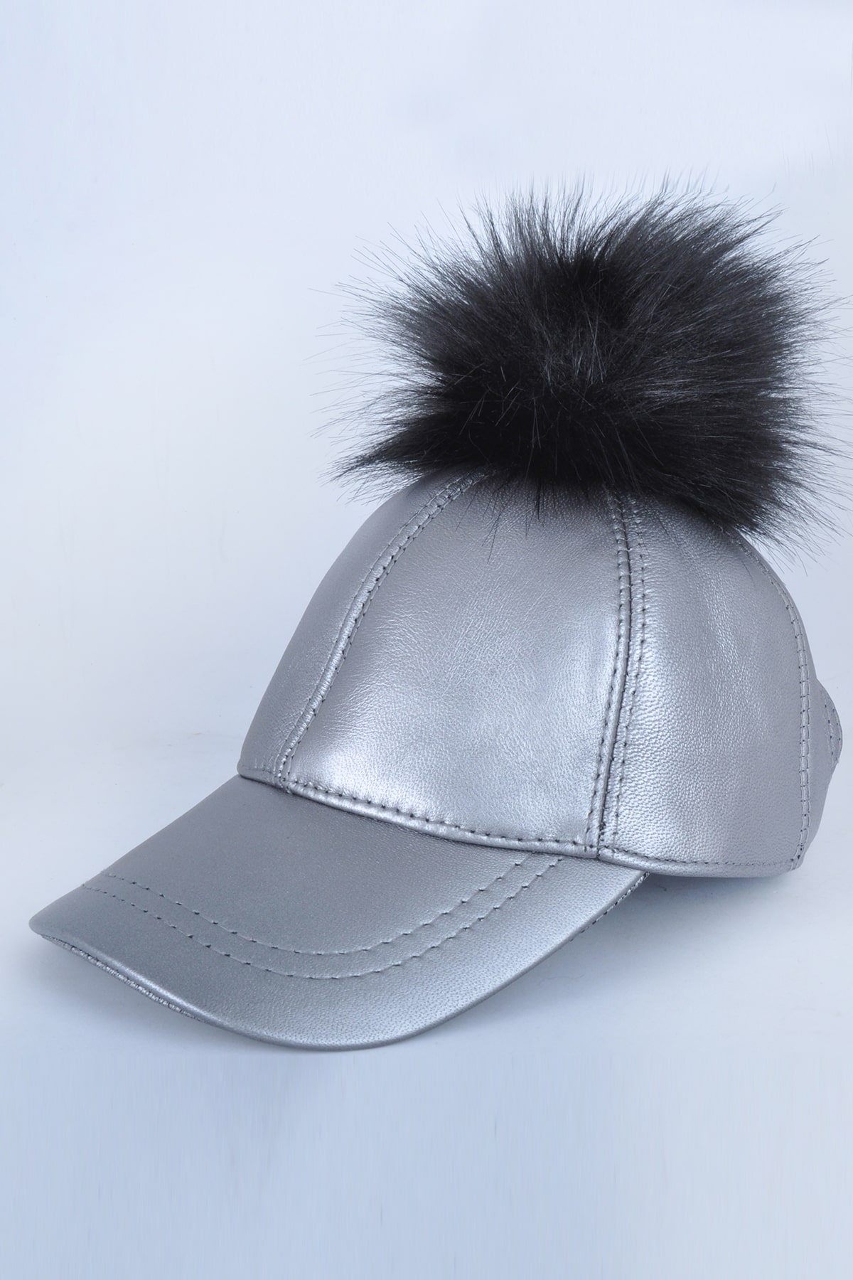 Tek Siyah Ponponlu Gümüş Deri Şapka
