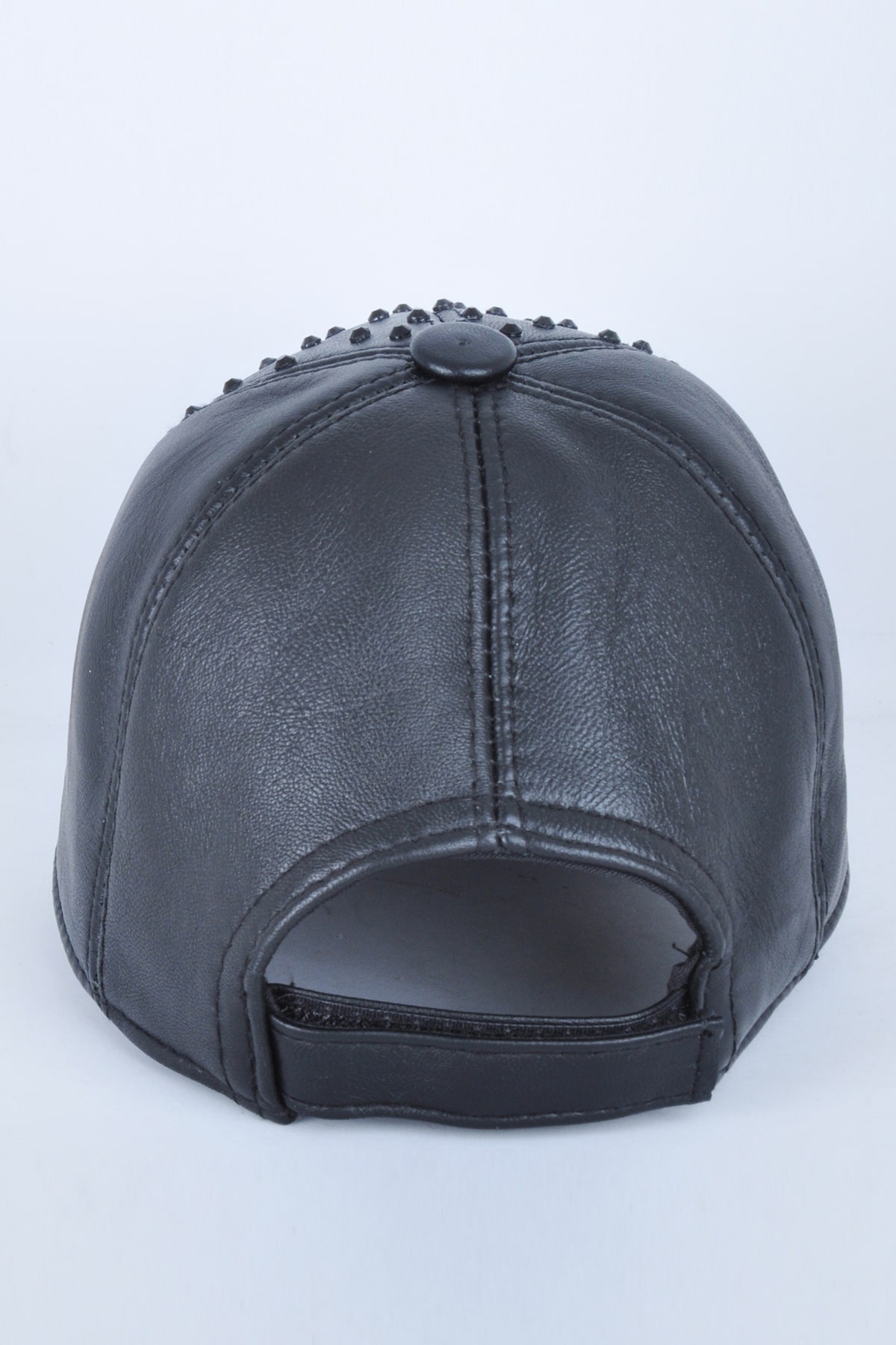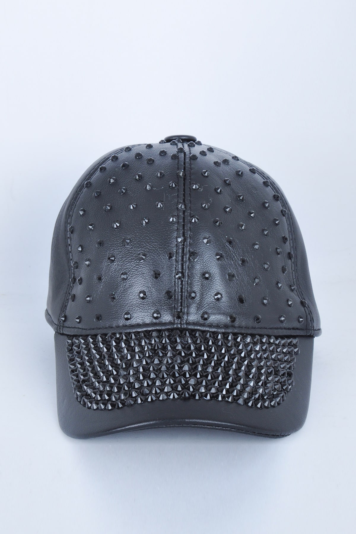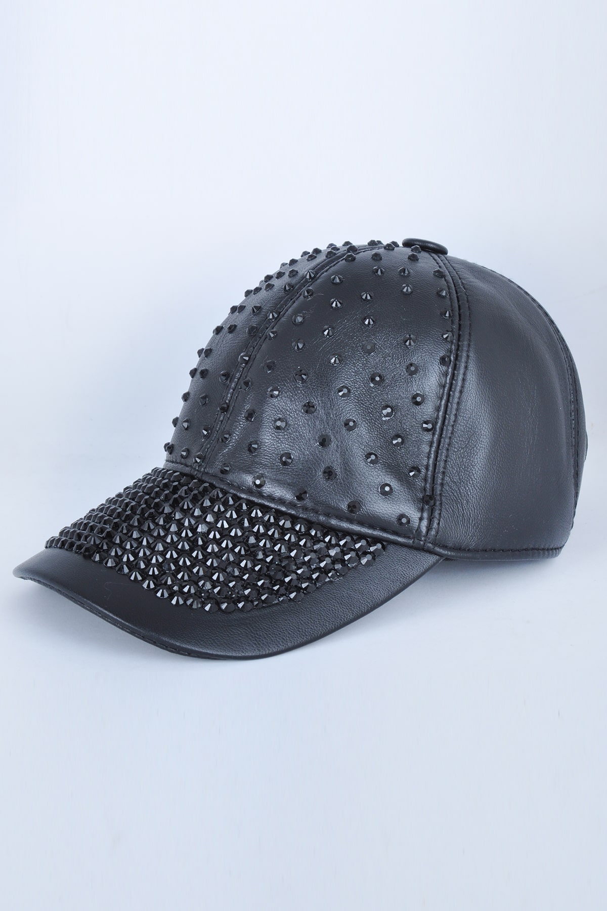 Siyah Parlak Taşlı Siyah Deri Şapka